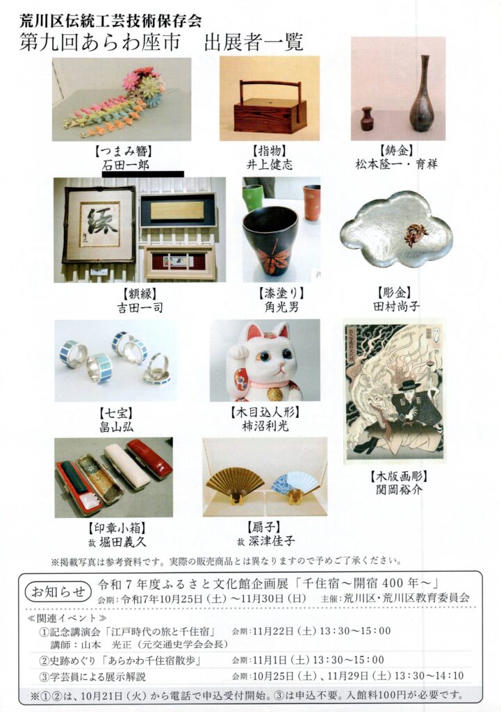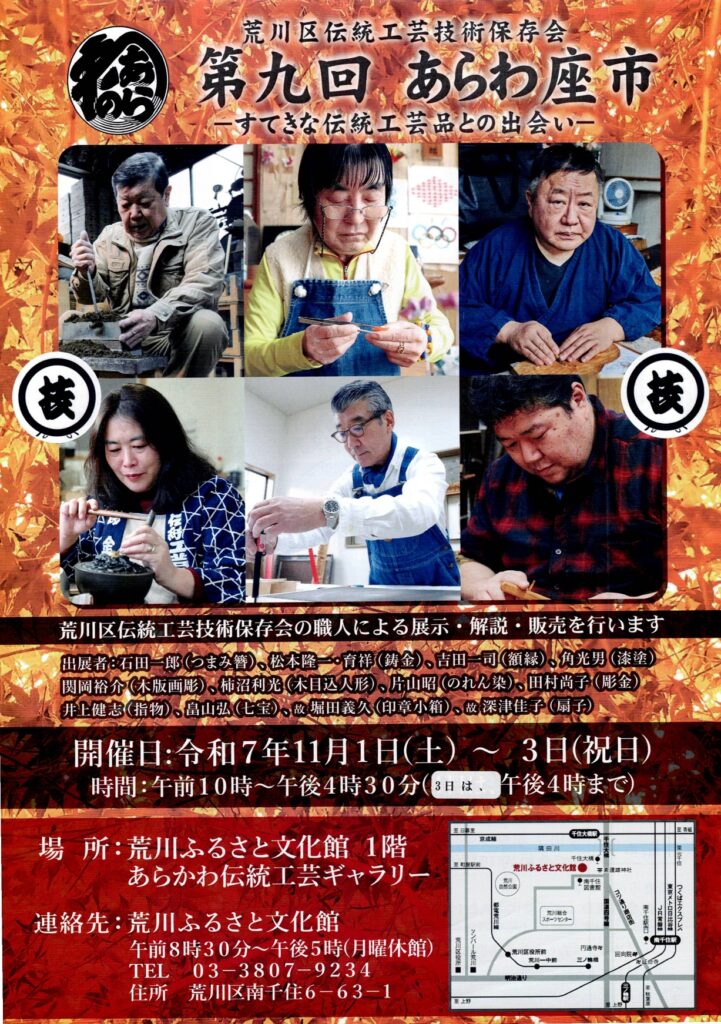 私の所属する荒川区伝統工芸技術保存会の仲間による数々の作品展示、解説、販売を行います。